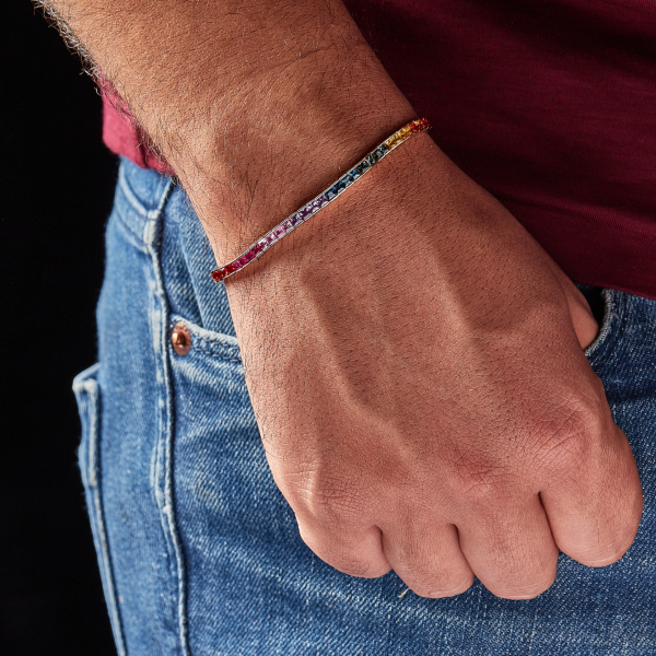 El diseño sin fin de la pulsera simboliza la continuidad y la eternidad, añadiendo un toque de elegancia y estilo atemporal a la joya. Los zafiros de colores, que van desde tonos azules profundos hasta tonos rosados, amarillos, verdes y más, crean un efecto visual arcoíris que evoca la belleza y la alegría de los colores naturales.